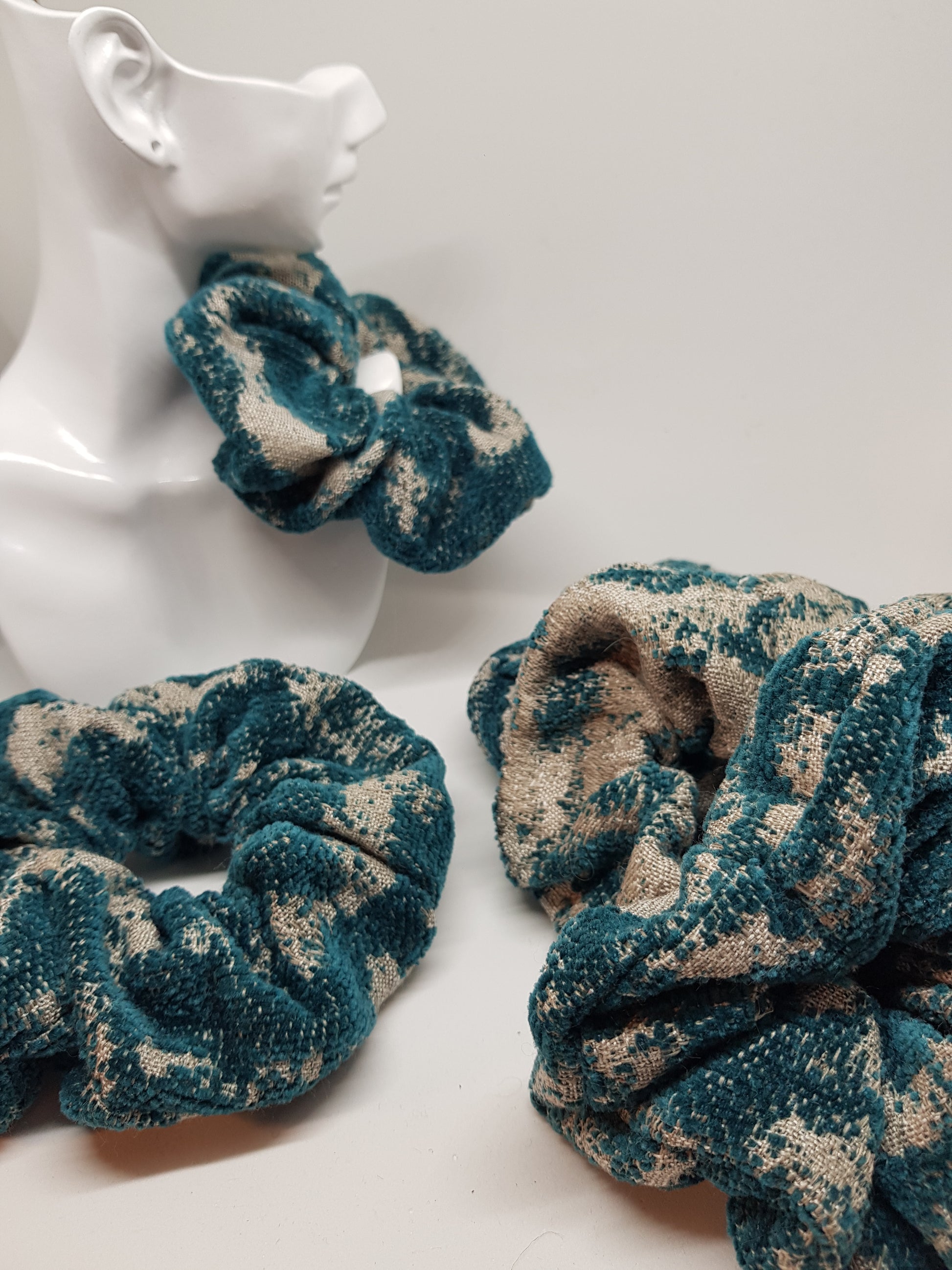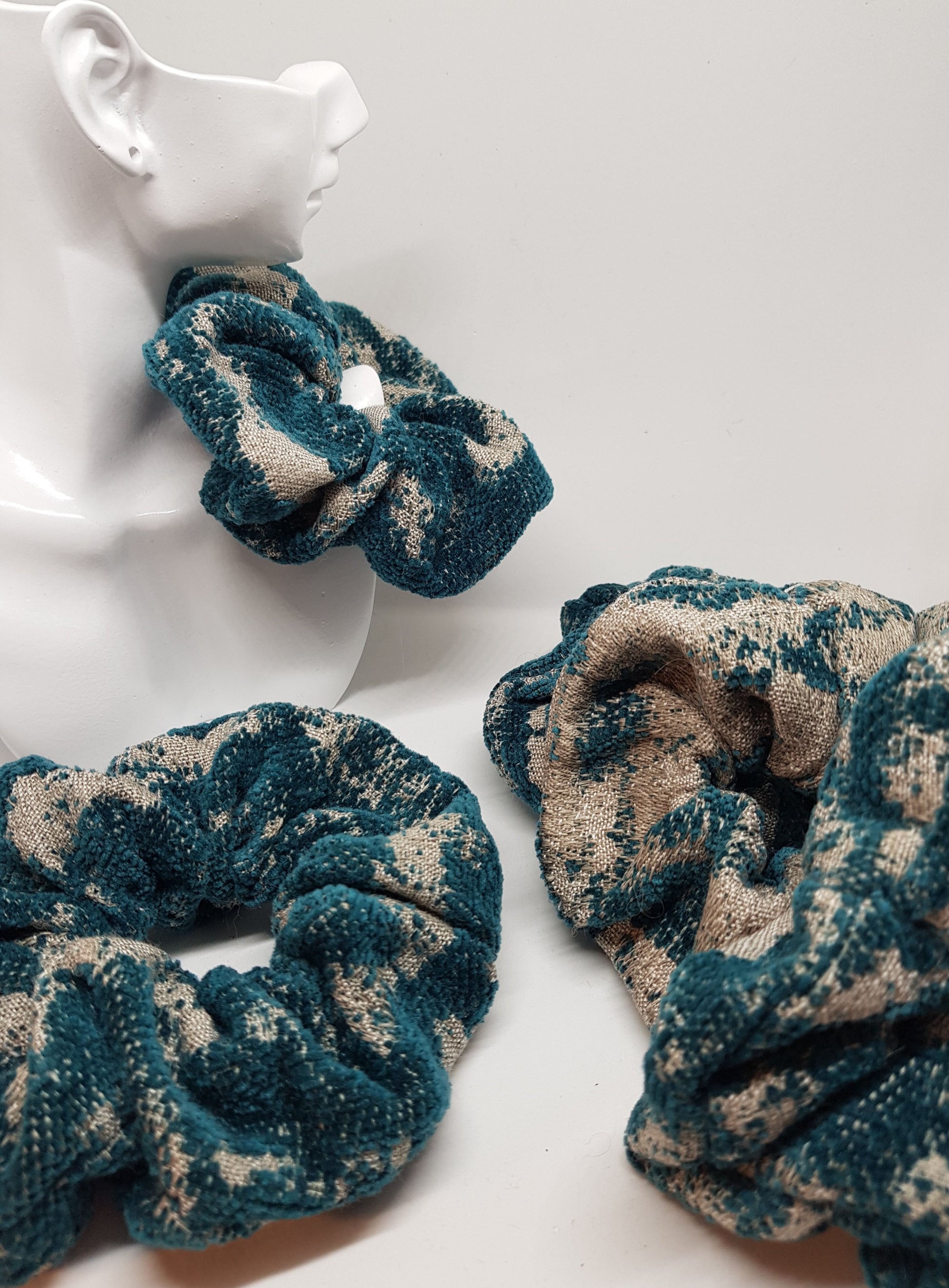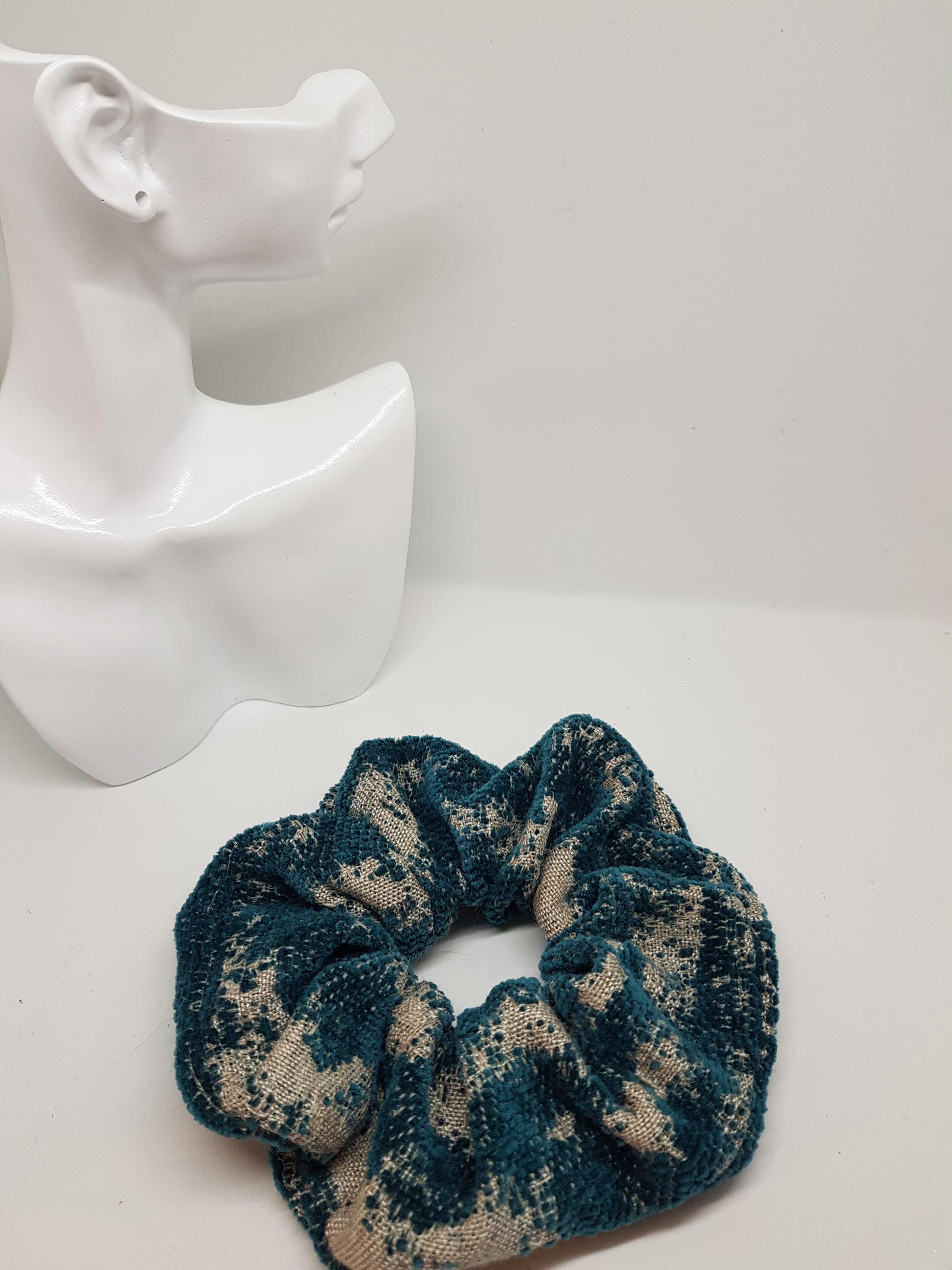 Ce chouchou effet velours dévoré est parfait pour les coiffures hivernales. Son tissu en velours épais bleu canard et beige apporte une touche d'originalité. Adoptez-le pour un look tendance en toute simplicité.