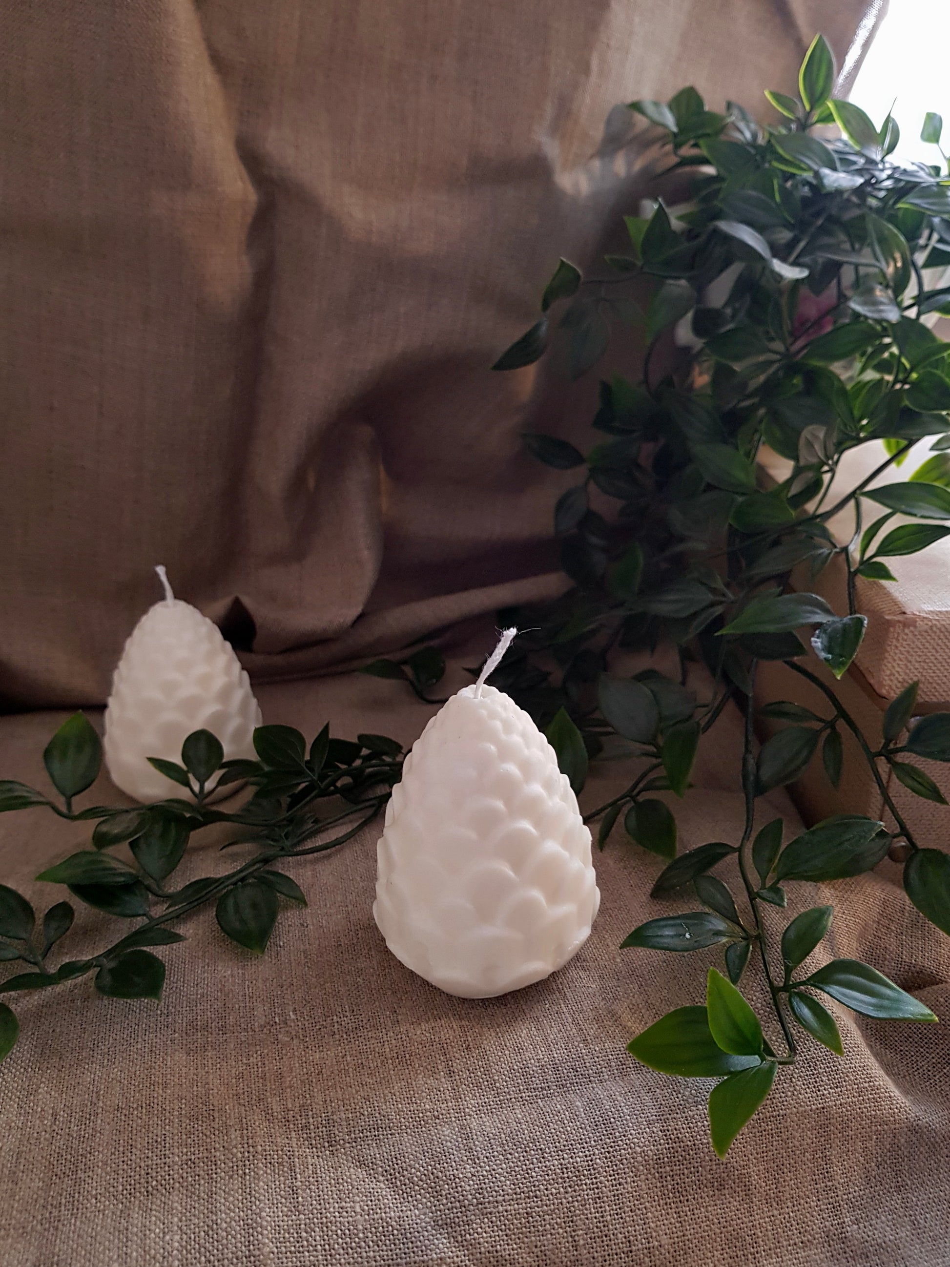 Notre bougie à la forme de pomme de pin, sera idéale pour vos décorations naturelles, de noël, d'automne, elle est 100% vegan en cire de soja coulée à la main par mes soins.